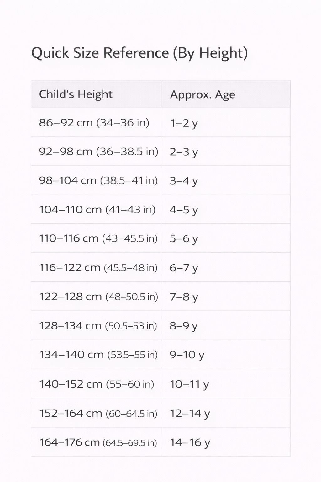 We include age as a helpful reference since many parents shop by age first, but the age shown simply matches the average height range for that stage. For the best fit, always choose based on height whenever possible.